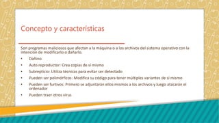 Los virus informáticos se originaron en 1939 y se han vuelto más sofisticados a lo largo de los años. Son programas maliciosos que dañan sistemas operativos al replicarse y propagarse de forma automática. Existen varios tipos como virus de sistema, multipartitos, caballos de Troya y macros. Los antivirus monitorean en tiempo real para detectar y eliminar virus, mientras que las vacunas previenen y tratan de eliminar virus conocidos.