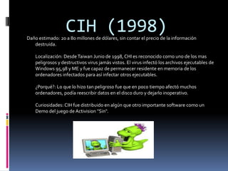 Este documento resume información sobre varios virus informáticos importantes desde 1998 hasta 2004, incluyendo CIH, Melissa, ILOVEYOU, Code Red, SQL Slammer, Blaster, Sobig.F, Bagle, MyDoom y Sasser. Describe el daño estimado causado, cómo y cuándo se propagaron, y curiosidades sobre cada virus.