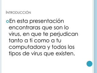 El documento presenta una visión general de los virus informáticos, incluyendo su definición, funcionamiento, historia, características, métodos de propagación y protección. Se describe cómo los virus pueden dañar computadoras, interferir en el funcionamiento normal y propagarse a través de software. Además, se mencionan diversos tipos de virus y acciones que pueden realizar, así como medidas para prevenir infecciones.