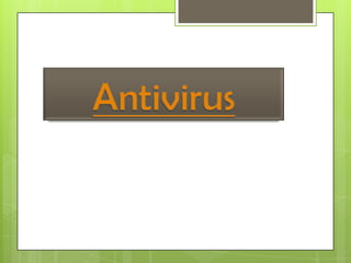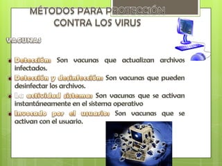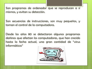Este documento describe los virus informáticos, sus características y tipos. Los virus son programas dañinos que se reproducen a sí mismos y toman control de las computadoras. Algunos tipos de virus mencionados incluyen virus de boot, virus de archivos ejecutables, caballos de Troya, bombas de tiempo y gusanos. El documento también discute medidas para prevenir infecciones virales como realizar copias de seguridad y usar programas antivirus.