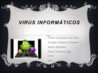 Este documento describe diferentes tipos de virus informáticos, incluyendo troyanos, gusanos, bombas lógicas, hoaxes y jokes. Explica que los virus son programas maliciosos que alteran el funcionamiento de las computadoras sin el conocimiento del usuario y que se propagan rápidamente. También proporciona detalles históricos sobre los primeros virus y sus síntomas.