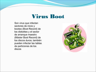 El documento describe diferentes tipos de malware como virus de boot, bombas de tiempo, gusanos, troyanos, hijackers, keyloggers, zombies, virus de macro, Blaster, Código Rojo, Klez, Melissa, Michelangelo y SQL Slammer. Proporciona detalles sobre cómo funcionan y los daños que causan cada uno.
