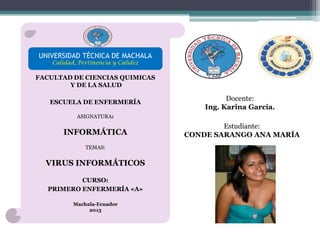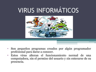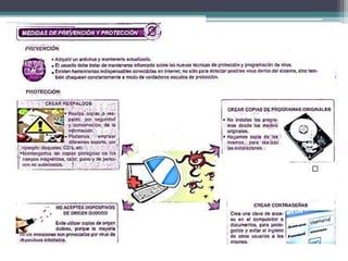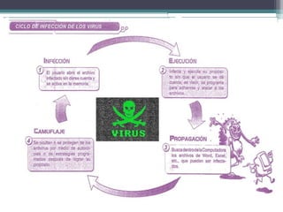 Este documento trata sobre los virus informáticos. Explica que los virus son pequeños programas creados para alterar el funcionamiento de una computadora sin el permiso del usuario. Describe tres tipos de virus: el gusano, que se reproduce a sí mismo e infecta otras computadoras a través de una red; el caballo de Troya, que es un programa legítimo con instrucciones malignas para robar información; y la bomba lógica, que esconde un programa dañino programado para activarse en una fecha específica. Además, ofrece pasos para