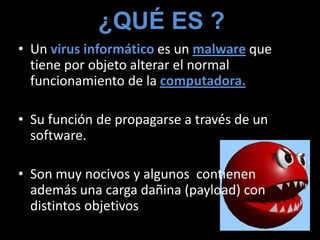 Un virus informático es un malware que altera el funcionamiento de una computadora propagándose a través de software. Los virus pueden reemplazar archivos ejecutables, destruir datos o ser molestos. Se ejecutan programas infectados, el virus queda en la RAM y luego infecta otros archivos ejecutables al ser llamados, completando así su replicación.