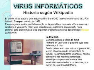 El primer virus de computadora, llamado Creeper, atacó una máquina IBM Serie 360 en 1972. Este virus emitía el mensaje "I'm a creeper... catch me if you can!" en la pantalla. Para eliminar este problema se creó el primer programa antivirus llamado Reaper. Aunque el término "virus" no se adoptó hasta 1984, estos ya existían desde antes en los laboratorios de Bell Computers, donde cuatro programadores desarrollaron un juego llamado Core War.