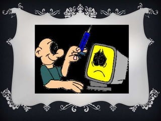Los virus informáticos son programas que alteran el funcionamiento de computadoras, infectando archivos y causando pérdidas de datos. Existen varios tipos de virus, como gusanos, caballos de Troya y bombas lógicas, que tienen diferentes métodos de operación y formas de infección. Para protegerse, se recomienda instalar un firewall, realizar copias de seguridad y mantener actualizado el sistema operativo y el antivirus.