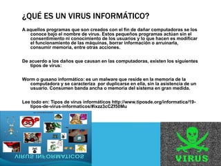 El documento describe qué son los virus informáticos y diferentes tipos como gusanos, caballos de Troya y bombas lógicas. También describe qué son los antivirus y diferentes tipos como detectores, eliminadores-reparadores e inmunizadores. Además, ofrece consejos sobre cómo eliminar virus y evitar infecciones.