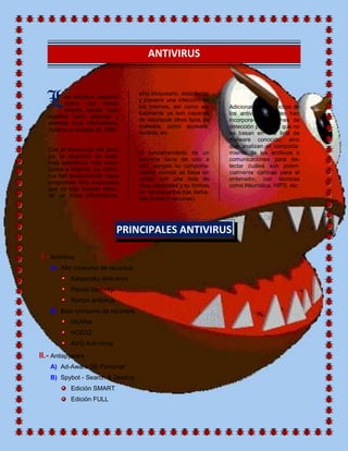 Un virus informático es un código malicioso que se replica a sí mismo insertándose en otros programas, mientras que los gusanos son programas independientes que se replican a través de redes. Los troyanos ocultan su verdadera función para engañar al usuario y causar daños. Los antivirus evolucionaron de detectar solo virus a bloquear, desinfectar y prevenir diferentes tipos de malware mediante firmas, heurística y otros métodos.