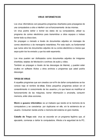 El documento describe diferentes tipos de virus informáticos, incluyendo virus, gusanos, caballos de Troya y bombas lógicas. Explica cómo se propagan los virus a través de archivos adjuntos de correo electrónico o descargas y cómo infectan las computadoras. También describe cómo eliminar virus e impedir infecciones.