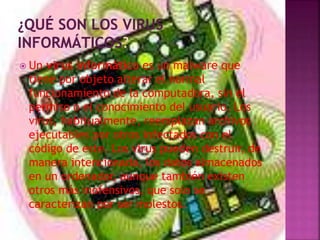 El documento describe los virus informáticos, explicando que son programas maliciosos que se replican a sí mismos para infectar otros archivos y sistemas sin el permiso del usuario, pudiendo causar daños o interrupciones. Explica también otros tipos de malware como gusanos, troyanos, bombas lógicas y hoaxes, señalando sus características y objetivos de dañar sistemas o robar información.