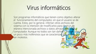 Este documento describe los virus informáticos, sus tipos (macro virus, virus residentes en memoria, virus de directorio, virus de e-mail), características (polimórficos, residentes y no residentes, virus stealth, etc.) y también describe los antivirus informáticos, incluyendo algunos de los principales antivirus como Norton y Kaspersky, así como sus tipos y características.