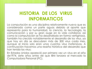 El documento proporciona una reseña histórica del desarrollo de los virus informáticos, desde el primer virus detectado en Estados Unidos en 1974 hasta los diferentes tipos de virus como boot, macro, multipartitas, gusanos, troyanos y hoaxes. También describe métodos de infección, propagación, protección y los sistemas operativos Windows, MS-DOS, Unix que son blanco frecuente de los virus.