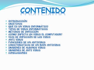 El documento habla sobre virus informáticos y antivirus. Explica que los virus son programas maliciosos que se propagan a otros ordenadores y los dañan sin el consentimiento del usuario. Luego describe varios tipos de virus e indica formas en que un ordenador puede infectarse. Finalmente, detalla cómo funcionan los antivirus y vacunas para detectar y eliminar virus, y las características que debe tener un buen programa antivirus.