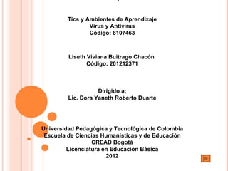 Este documento describe los virus informáticos, sus clasificaciones, tipos, ciclo de vida y formas de prevención. Explica qué son los virus, cómo se clasifican en función de su comportamiento y dónde infectan (sector de arranque, archivos, macros, etc). También cubre los antivirus, sus funciones y tipos más comunes como McAfee y Symantec. El objetivo es concientizar sobre los riesgos de los virus y cómo protegerse con actualizaciones de software antivirus.