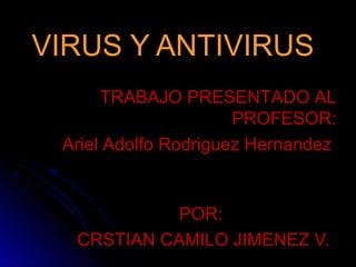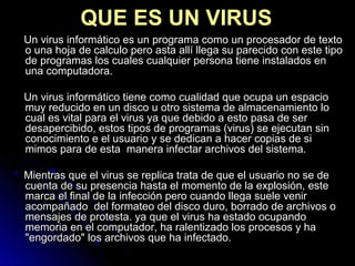 Este documento describe los virus informáticos y antivirus. Explica que un virus es un programa malicioso que se replica a sí mismo para infectar otros archivos sin el conocimiento del usuario. Describe varios tipos de virus como troyanos, bombas de tiempo, lombrices y virus de boot o programa. También explica que los antivirus detectan y eliminan los virus, y han evolucionado para bloquear otras amenazas además de virus. Menciona algunos de los antivirus más conocidos como Avast, McAfee, Norton, Kaspersky y Panda.