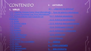 Este documento describe diferentes tipos de virus y antivirus informáticos. Explica qué son los virus informáticos, cómo funcionan y algunos ejemplos como Sobig, Blaster y SQL Slammer. También describe varios tipos de antivirus como preventores, identificadores y descontaminadores. Finalmente, concluye que los virus no solo se crean para dañar computadoras y que tanto virus como antivirus son programas necesarios para mantener la seguridad y rendimiento de los ordenadores.