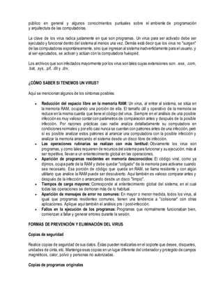 Los virus informáticos son programas dañinos que se reproducen a sí mismos e interfieren con el hardware y software de una computadora. Existen varios tipos de programas nocivos similares a los virus como caballos de Troya, bombas lógicas y gusanos. Los antivirus son programas diseñados para combatir y eliminar virus mediante la detección y remoción de archivos infectados, aunque deben mantenerse actualizados para ser efectivos.