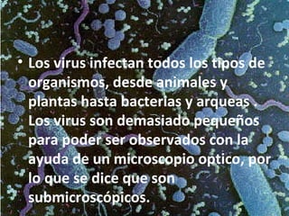 Este documento describe las características de los virus y bacterias. Explica que los virus infectan una amplia variedad de organismos y son demasiado pequeños para ser vistos con un microscopio óptico. Además, señala que los virus están compuestos generalmente de material genético y una cubierta proteica o envuelta, y son organismos parásitos que infectan células para reproducirse. Por último, sugiere que los virus coevolucionan con sus huéspedes debido a que requieren de la supervivencia del huésped para aseg