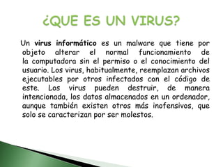 Los virus informáticos son programas maliciosos que se propagan sin el permiso del usuario y pueden dañar los sistemas. Existen varios tipos como virus, gusanos, troyanos y hoaxes. Los virus más comunes infectan archivos ejecutables y el sector de arranque de dispositivos de almacenamiento para propagarse. También pueden instalarse en la memoria de los sistemas basados en Windows para esperar y ejecutarse cuando se activen programas específicos, causando daños a los datos y sistemas.