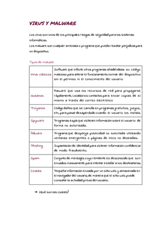 Los virus y malware representan riesgos significativos para la seguridad de los sistemas informáticos. Existen diversos tipos de malware, como virus, gusanos, troyanos, spyware, adware y phishing, cada uno con métodos únicos de ataque. Las cookies son pequeñas informaciones almacenadas en navegadores que permiten a los sitios web rastrear la actividad del usuario.
