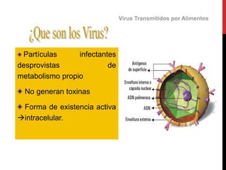 Este documento describe diferentes virus y parásitos transmitidos por alimentos. Explica los síntomas, ciclos de vida, fuentes de contaminación y brotes asociados con virus como el Norwalk, Rotavirus, Hepatitis A y virus aviar. También cubre parásitos como Clonorchis siniensis, Fasciola hepatica, Taenia solium y Taenia saginata, detallando sus hospedadores y formas de transmisión. El objetivo es crear conciencia sobre estos patógenos y medidas para prevenir su propagación a través de alimentos.