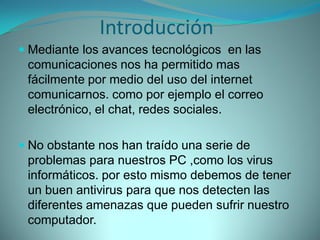 Este documento proporciona información sobre virus informáticos, incluyendo qué son los virus, cómo se infectan las computadoras, técnicas comunes de infección, y cómo prevenir y eliminar virus con antivirus. Explica varios tipos de virus como virus de archivo, residentes, boot y gusanos. También describe características clave de los antivirus y ejemplos populares como Norton y McAfee.