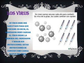Los virus informáticos son programas dañinos que se replican a sí mismos e interfieren con el hardware o software de una computadora. Existen varios tipos de programas nocivos como caballos de Troya, bombas lógicas y gusanos. Los virus se propagan a través de estrategias como la añadidura, reorientación o polimorfismo. Las vacunas antivirus buscan eliminar virus específicos del disco duro o las memorias USB las eliminan físicamente.