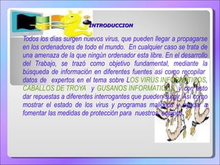 El documento habla sobre virus y vacunas informáticas. Explica que los virus son programas creados para dañar computadoras e infectar otros archivos y sistemas. Se clasifican en virus de programa, residentes y troyanos. Los gusanos se replican rápidamente entre sistemas para consumir recursos. Se recomienda usar antivirus como Nod32 y McAfee para detectar y eliminar estas amenazas.