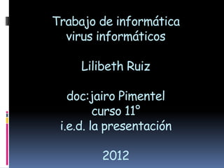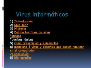 Este documento describe los virus informáticos, incluyendo su definición, historia, tipos (gusano, bombas lógicas), cómo prevenirlos y eliminarlos, ejemplos de virus (Bagle, Sabig, Cascade) y sus acciones, y una conclusión sobre los problemas que causan.