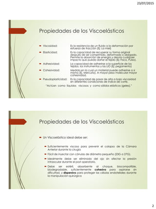 Los viscoelásticos son sustancias químicas utilizadas en cirugía oftálmica para mejorar el control durante la operación. Presentan propiedades de viscosidad, elasticidad, adhesividad, cohesividad y pseudoplasticidad. Existen viscoelásticos cohesivos, dispersivos y viscoadaptativos, los cuales se eligen dependiendo de la etapa quirúrgica.