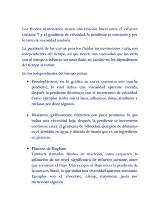 Este documento describe la viscosidad de los fluidos. Explica que los fluidos newtonianos tienen una viscosidad constante donde el esfuerzo cortante es directamente proporcional al gradiente de velocidad. Los fluidos no newtonianos pueden ser independientes o dependientes del tiempo, donde la viscosidad varía con factores como la velocidad o temperatura. Menciona ejemplos comunes de fluidos pseudoplásticos, dilatantes y plásticos de Bingham.