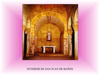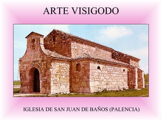 El documento presenta ejemplos representativos del arte visigodo como la iglesia de San Juan de Baños con sus plantas y detalles interiores, la iglesia de San Pedro de la Nave con sus plantas y capiteles que representan pasajes bíblicos como el sacrificio de Isaac y Daniel en el foso de los leones, la iglesia de Quintanilla de las Viñas con detalles de su fachada, y la corona votiva del rey Reccesvinto como ejemplos característicos de la arquitectura y escultura religiosa de la época