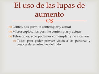 El documento contiene varias secciones sobre la visión y el liderazgo. Habla sobre cómo los lentes, microscopios y telescopios amplían nuestra visión, y sobre los cuatro niveles de gente y su relación con la visión. También discute cómo apropiarse personalmente de una visión y los obstáculos que pueden enfrentar cuando la visión es corporativa. Concluye enfatizando la importancia de tener una mente ocupada en algo productivo y de conocer el corazón de Dios.