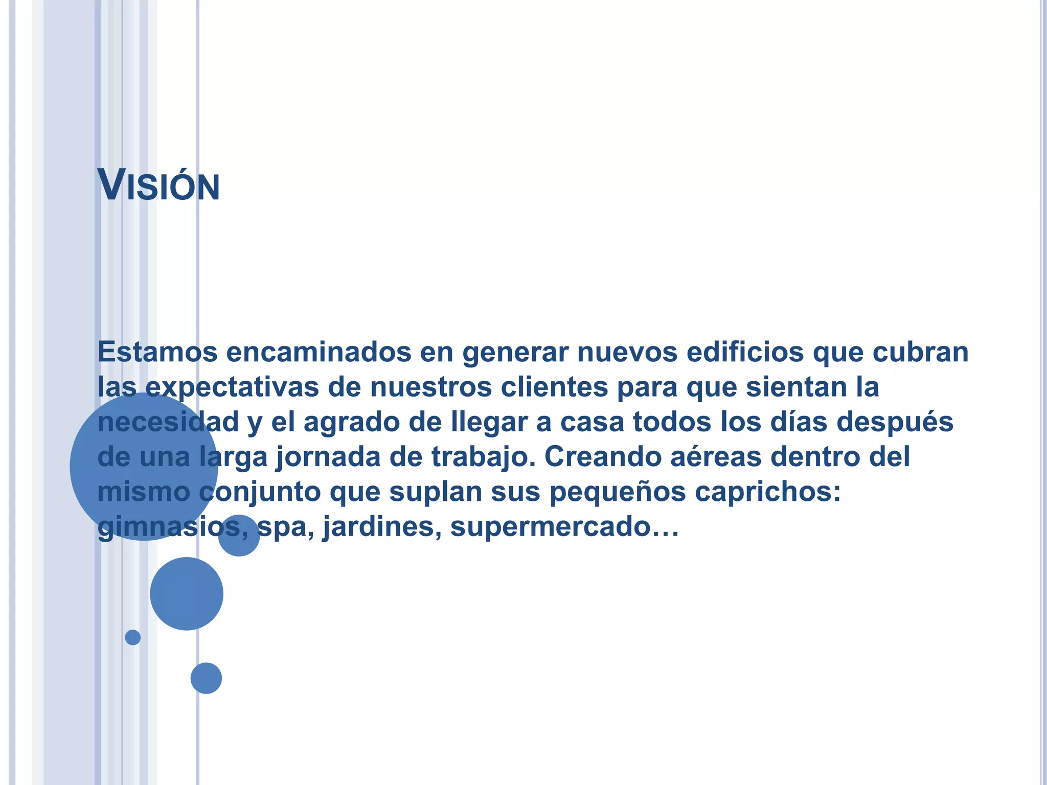 La visión de la compañía es generar nuevos edificios residenciales que cubran las expectativas de los clientes y les brinden la necesidad y el agrado de llegar a casa después de un largo día de trabajo, creando áreas dentro del conjunto como gimnasios, spas, jardines y supermercados para satisfacer sus necesidades.