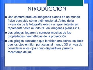 La visión artificial es un subcampo de la inteligencia artificial que busca establecer la relación entre el mundo tridimensional y sus vistas bidimensionales. Los griegos ya conocían propiedades geométricas de la proyección de imágenes 2D a partir del mundo 3D. La visión artificial tiene como objetivos la detección, segmentación y reconocimiento de objetos en imágenes, así como el registro y seguimiento de objetos en secuencias de imágenes para mapear escenas 3D. El proceso de visión por computadora incluye la creación de una imagen a partir