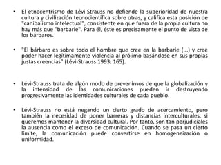 El documento presenta diferentes visiones de la estrategia de marketing internacional. La visión etnocéntrica defendida por Lévi-Strauss apoya un etnocentrismo moderado que valora la diversidad cultural y rechaza la superioridad de una cultura sobre otras. La visión geocéntrica de Primark considera que no hay diferencias entre el marketing internacional y doméstico debido a la globalización. La visión policéntrica de Philips reconoce que los mercados externos son importantes y que las culturas varían entre países.