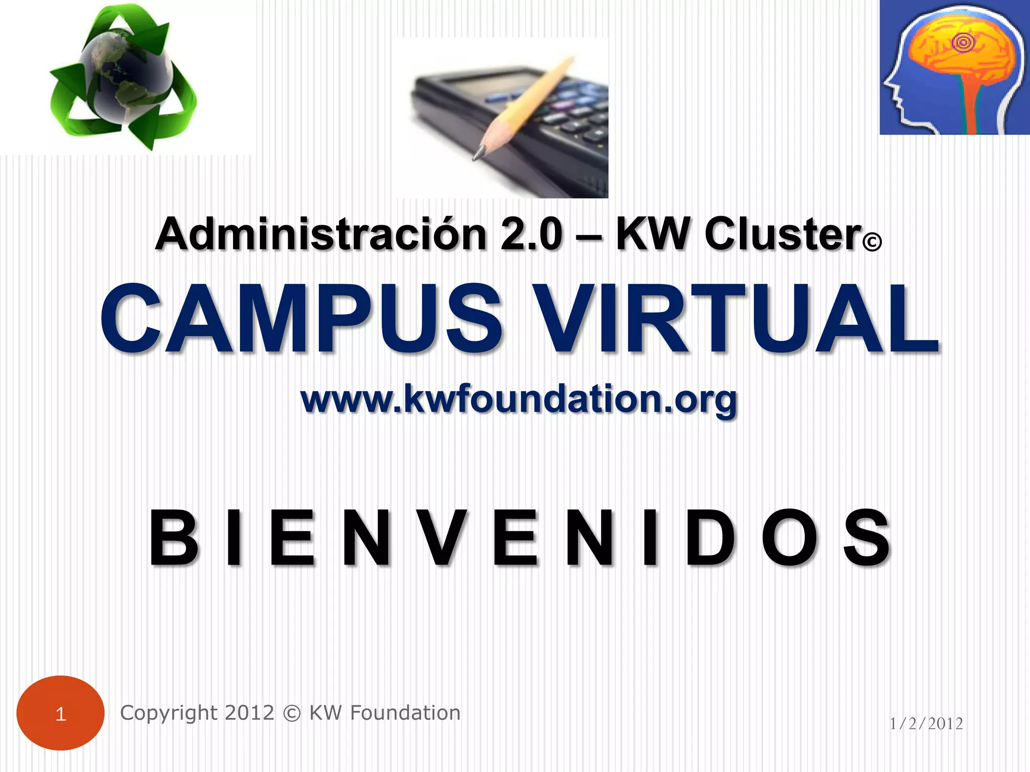 El documento presenta la KW Foundation y su enfoque en la administración 2.0, destacando la creación de un entorno colaborativo para la generación de conocimiento. Se mencionan beneficios significativos como ahorros en gastos operativos y mejora en la calidad de productos y servicios. Además, se proponen herramientas y recursos prácticos para facilitar la capacitación y el manejo de proyectos dentro de esta nueva administración.