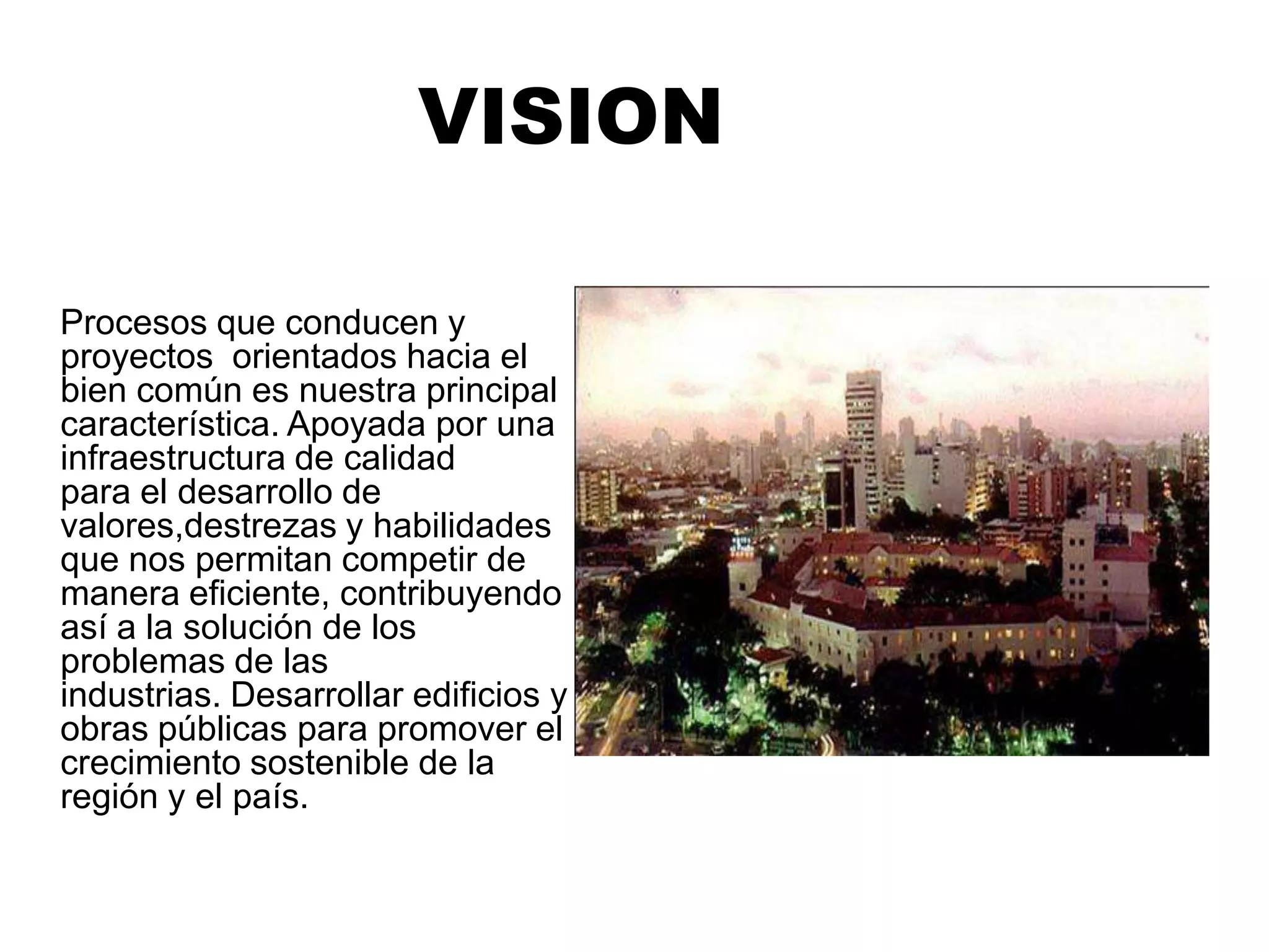 La visión se enfoca en procesos y proyectos orientados al bien común, apoyados por una infraestructura de calidad para desarrollar valores, destrezas y habilidades que permitan competir eficientemente y contribuir a resolver los problemas de las industrias. El objetivo también incluye desarrollar edificios y obras públicas para promover un crecimiento sostenible regional y nacional.