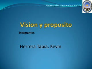 Este documento habla sobre la visión y el propósito de la Universidad Nacional del Callao. Define la visión como una imagen deseada del futuro, mientras que el propósito es similar a una dirección general o metas a largo plazo. Explica que la competencia permite sacar lo mejor de los demás y guiarnos hacia nuevas visiones. También destaca la importancia de mantener la tensión creativa a través de la perseverancia y la paciencia para lograr los objetivos.