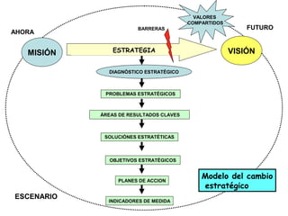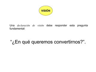 El documento presenta conceptos clave sobre la visión estratégica de una organización, incluyendo su definición como un conjunto de ideas que proveen el marco de referencia de lo que la organización quiere lograr en el futuro. Explica que una visión debe ser sencilla y compartida para provocar ilusión, y debe formularse de manera amplia y detallada sin usar números u objetivos genéricos. También identifica elementos importantes de una visión como el panorama futuro, marco competitivo, objetivos fundamentales y fuentes de ventaja competitiva.