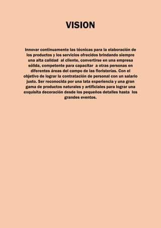 La visión de la empresa es innovar continuamente sus técnicas y servicios para ofrecer una alta calidad a los clientes, convertirse en una empresa sólida y competente para capacitar a otras personas en diferentes áreas de floristería, y ser reconocida por su amplia experiencia y gama de productos naturales y artificiales para lograr exquisitas decoraciones.