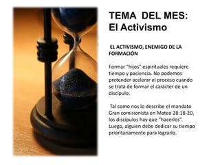 1) El activismo puede ser contraproducente para la formación espiritual ya que requiere tiempo y paciencia. 2) A menudo el activismo nace de inseguridades, ansiedad y culpas falsas. 3) Es importante establecer prioridades como la formación de discípulos, delegar tareas y vivir por agenda en lugar de urgencias.