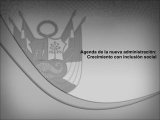El documento presenta una visión del desarrollo nacional de Perú desde la perspectiva del Estado y la interacción con el sector privado. Resalta que aunque Perú ha tenido un fuerte crecimiento económico, todavía enfrenta desafíos como la pobreza rural, desnutrición y baja calidad educativa. La nueva administración busca el crecimiento con inclusión social a través de programas como Juntos, Pensión 65 e inversiones en infraestructura rural.