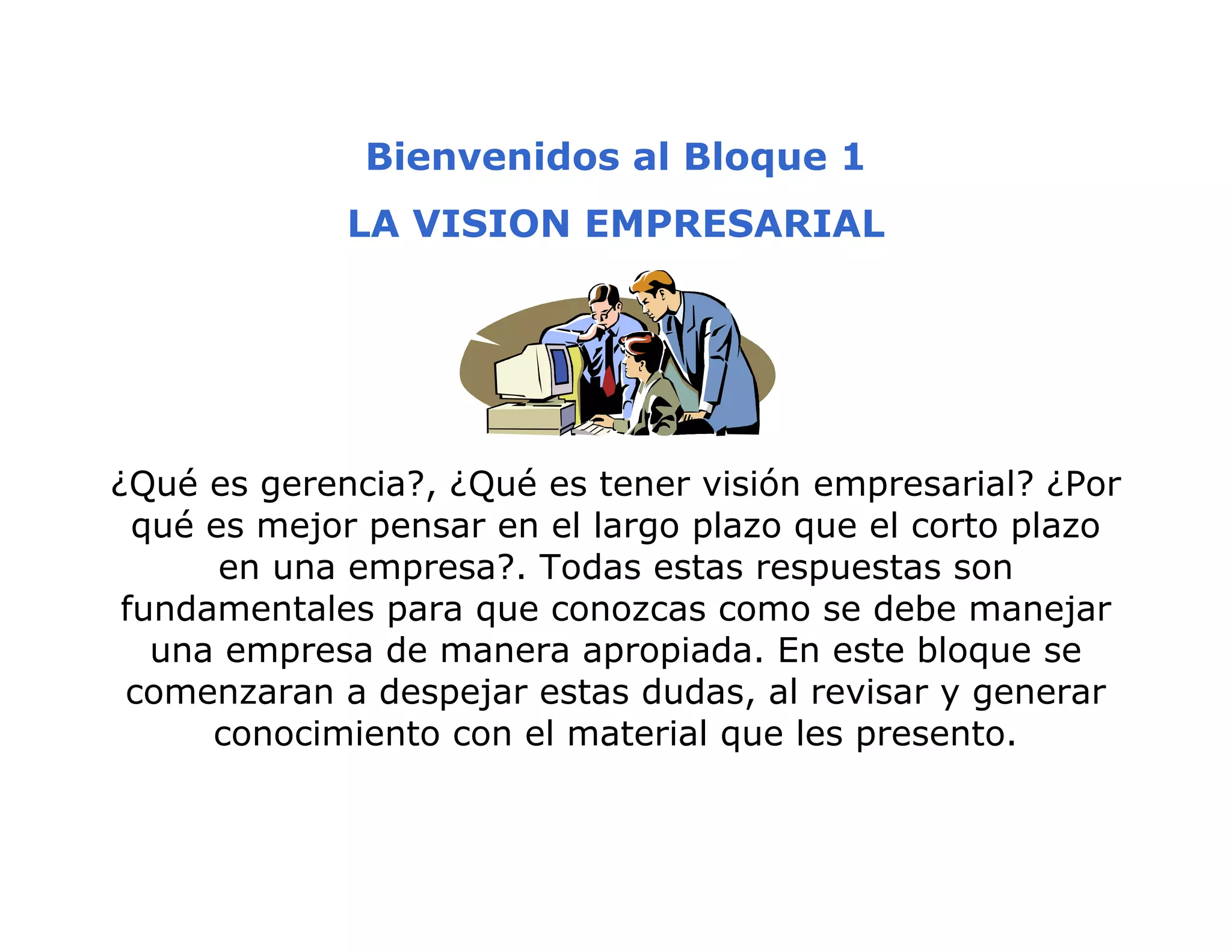 Este documento introduce el bloque 1 sobre la visión empresarial. Explica que se despejarán dudas sobre conceptos clave como gerencia y visión empresarial a largo plazo. El objetivo es generar conocimiento sobre cómo manejar adecuadamente una empresa revisando el material presentado.