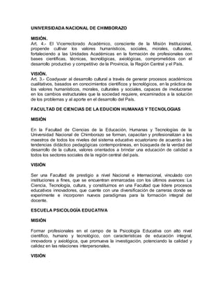 El documento presenta las misiones y visiones de la Universidad Nacional de Chimborazo, su Vicerrectorado Académico, la Facultad de Ciencias de la Educación Humanas y Tecnologías y la Escuela de Psicología Educativa. Todas comparten el objetivo de formar profesionales con conocimientos científicos y humanísticos comprometidos con el desarrollo del país a través de procesos educativos de calidad e innovación.