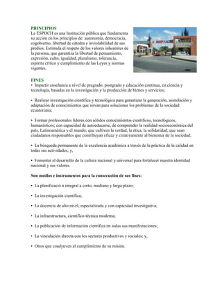 Este documento presenta la visión, misión, objetivos, principios y fines de la ESPOCH. La visión es ser una institución líder en educación superior y soporte científico-tecnológico para el desarrollo de la provincia de Chimborazo y del país. La misión es formar profesionales competitivos y conscientes de su identidad nacional a través de la generación y aplicación del conocimiento científico. Los objetivos incluyen lograr una administración eficiente y establecer una organización flexible para responder a las expectativ