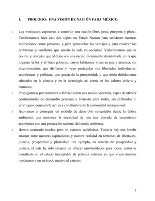 Este documento propone 10 pilares para lograr la visión de México como una nación próspera, justa y libre. Los pilares incluyen el reconocimiento de los derechos humanos, paz y seguridad, estado de derecho, estabilidad política y económica, gobierno eficaz, economía de mercado, capital humano, estabilidad macroeconómica, integración internacional y empresariado nacional. El objetivo es erradicar la pobreza mediante el crecimiento económico, empleos y competitividad para mejor