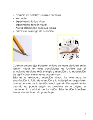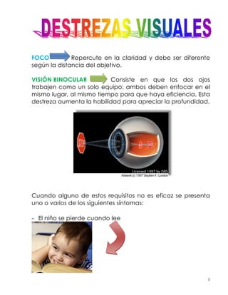 El documento describe los requisitos para una visión binocular efectiva, incluyendo el enfoque apropiado según la distancia y la coordinación de ambos ojos. Explica que cuando estos requisitos no se cumplen, puede causar síntomas como perderse al leer, cambiar palabras u olvidar letras. Además, destaca que cuando los ojos trabajan juntos se logra claridad visual y mayor atención, mientras que la tensión visual puede causar falta de atención e indisciplina. Finalmente, resalta la importancia de habilidades ocul