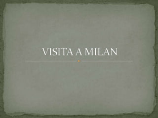Este documento presenta un recorrido turístico de 4 días por la ciudad de Milán, Italia. Cada día se visitan varios lugares históricos y culturales importantes como plazas, iglesias, estaciones de trenes y el Castillo Sforzesco. Algunos de los lugares destacados son el Lago Cairoli, la Catedral (Duomo) de Milán, el Teatro alla Scala, la Piazza della Repubblica y el estadio de fútbol San Siro. El objetivo es mostrar la rica historia, arqu