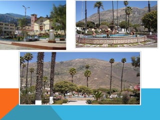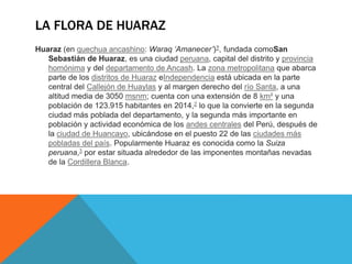 El documento describe la flora y fauna de la ciudad de Huaraz, Perú. Huaraz se encuentra en la parte central del departamento de Ancash, a una altitud de 3,100 metros sobre el nivel del mar. La flora incluye retamas y la fauna incluye venados, vicuñas, osos de anteojos, tarucas, pumas y zorros. El documento también brinda información sobre otras ciudades en el valle de Callejón de Huaylas, como Carhuaz, Yungay, Caraz, Huari y Recuay. El valle
